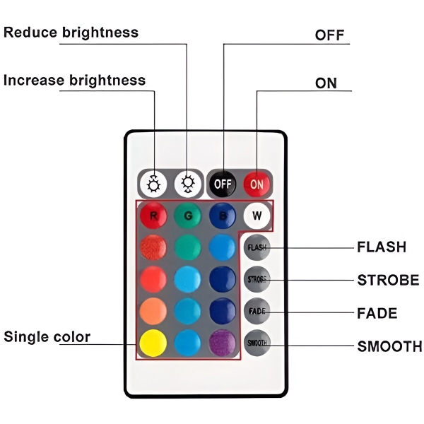 Az AQUASHEIN egy kényelmes távirányítóval rendelkezik, amellyel könnyen beállíthatja a világítást. A 24 gomb segítségével 16 RGB szín és négy dinamikus üzemmód (villogás, stroboszkóp, halványítás, sima) közül választhat. Akár 10 méteres távolságból is vezérelheti a fényeket, így biztosítva a problémamentes testreszabást.