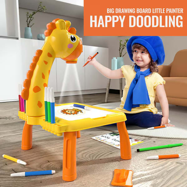Színes, zsiráf témájú vetítő, amely figyelemfelkeltő és szórakoztató a gyerekek számára, miközben fejleszti a motoros és kognitív képességeiket.