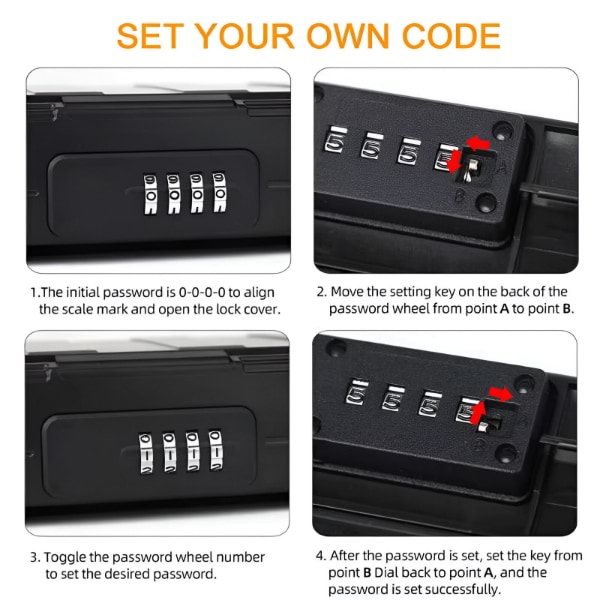 Értékei biztonságban vannak a SAFORY zárdobozban, amely 4 számjegyű kóddal rendelkezik és akár 10 000 lehetséges kombinációt kínál – sokkal biztonságosabb, mint a tipikus 3 számjegyű modellek.